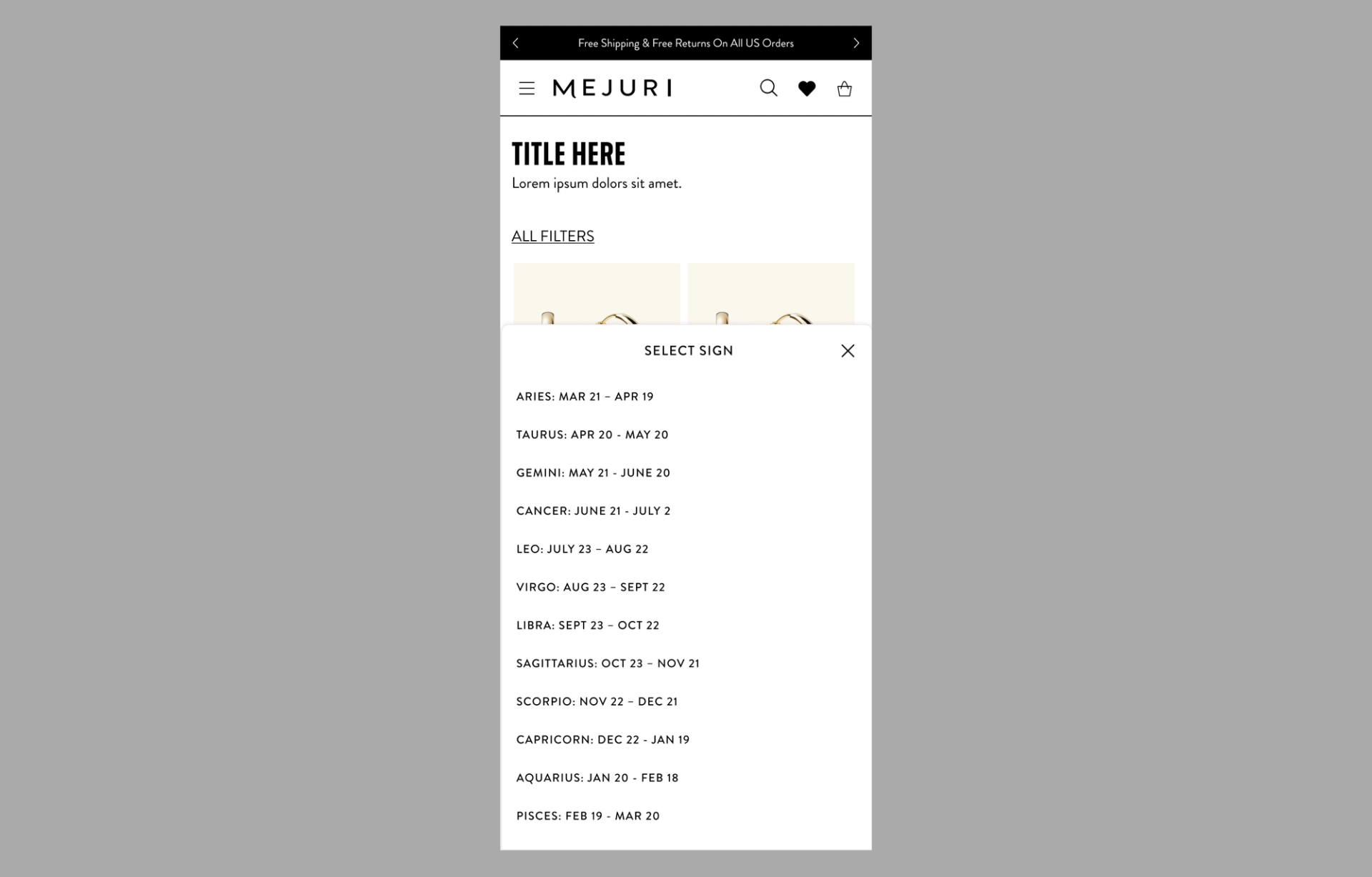 Product Card- Mobile, List Selector (Zodiac)
