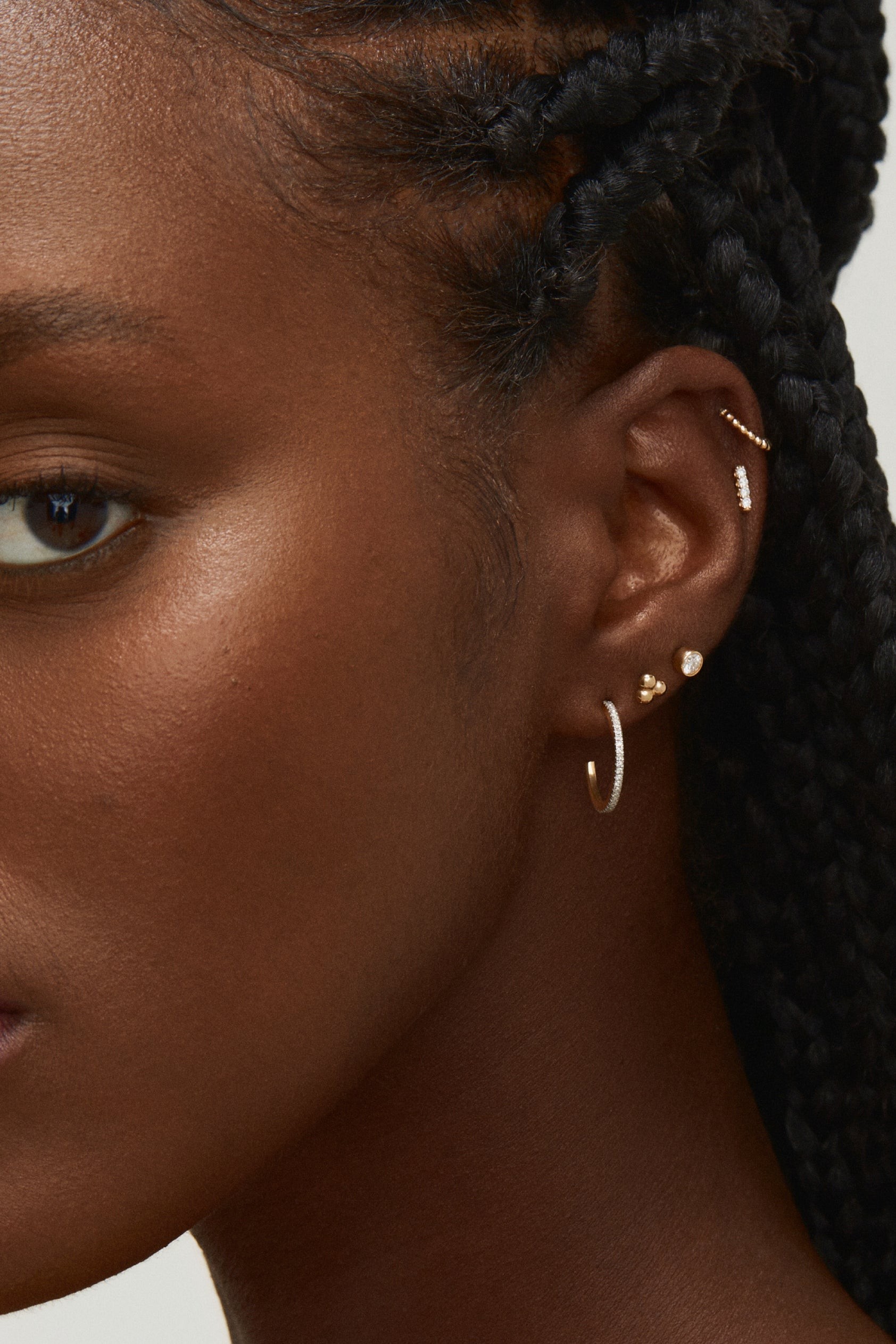 Studs, hoops, cartilage & helix, we don’t discriminate—the world is your diamond encrusted oyster. Mix it up with white and yellow gold, diamonds and a minimal cartilage hoop to draw it all together.