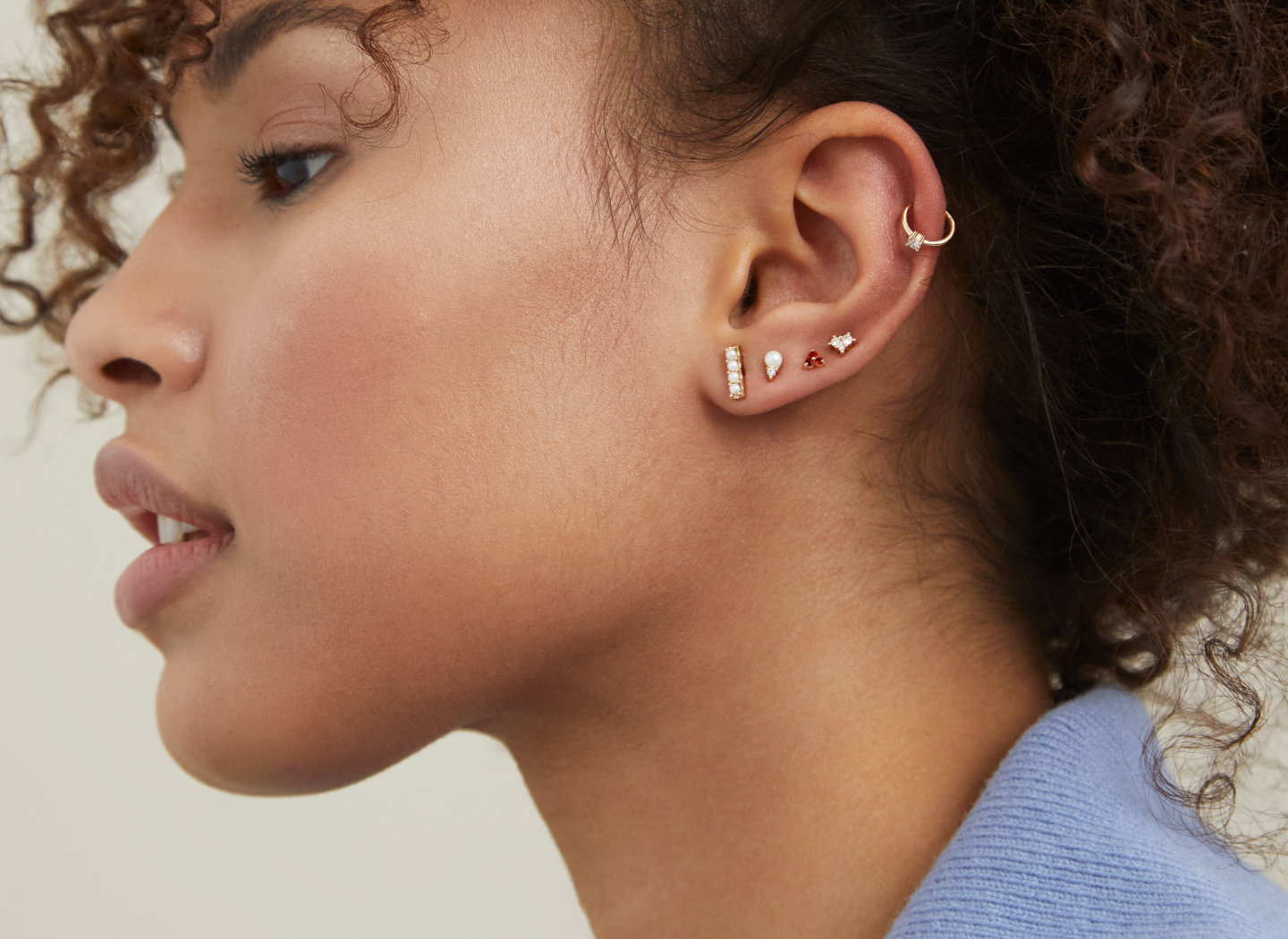 Our cartilage earrings are designed to be worn in any helix piercing. Our three, new cartilage styles—Beaded, Solo Diamond, and Pavé—are all designed to be worn in post-healed helix piercings. Please note, you cannot pierce your cartilage with these pieces.